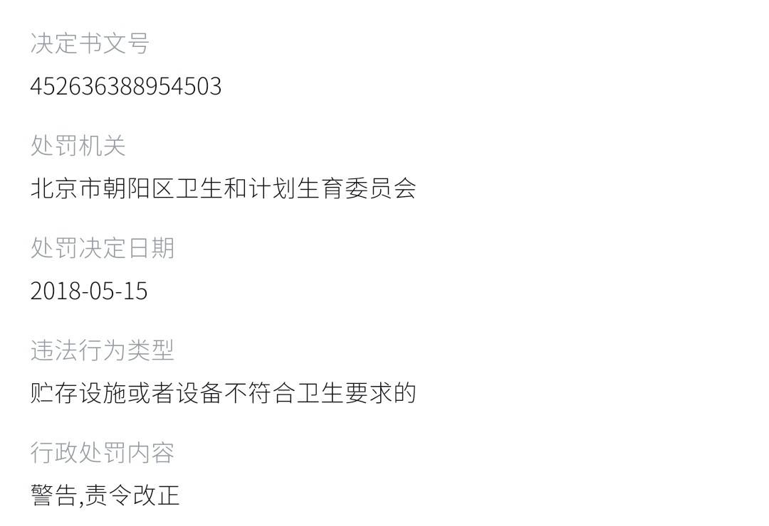 2018年5月15日,北京惠合嘉美医疗美容门诊部有限公司因贮存设施或者设备不符合卫生要求,被北京市朝阳区卫生和计划生育委员会处以警告并责令改正的行政处罚。