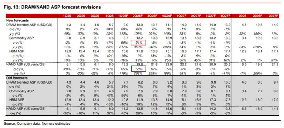 野村证券预计,2026 年第二季度商品 DRAM 和 NAND 价格环比涨幅将分别达到 51% 和 50%。