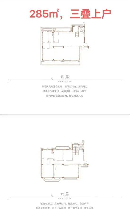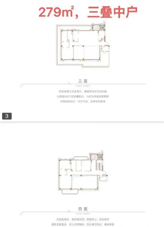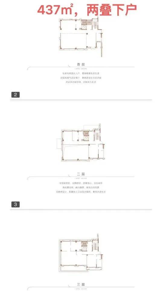 ●产品户型:两叠(上叠392㎡、下叠437㎡),三叠(上叠 285㎡、中叠279㎡、下叠305㎡)