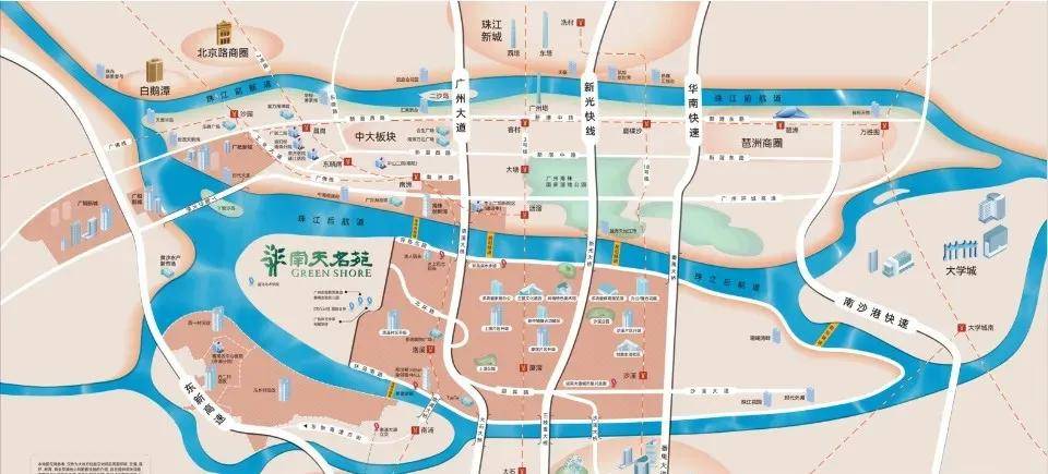 项目位于洛溪岛的岛尖,南天名苑是香港集团在广州城市中轴打造大型低密度岛尖江景豪宅,集地段、交通、规划利好、环境、景观、配套于一体,汇聚城市稀缺资源与极具发展潜力的项目