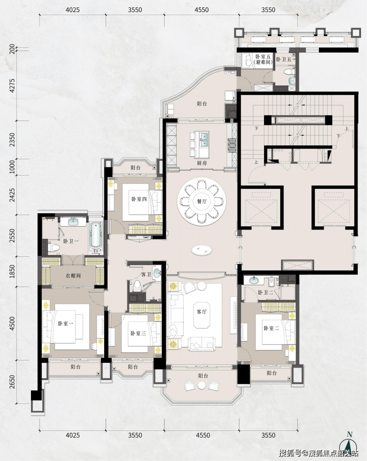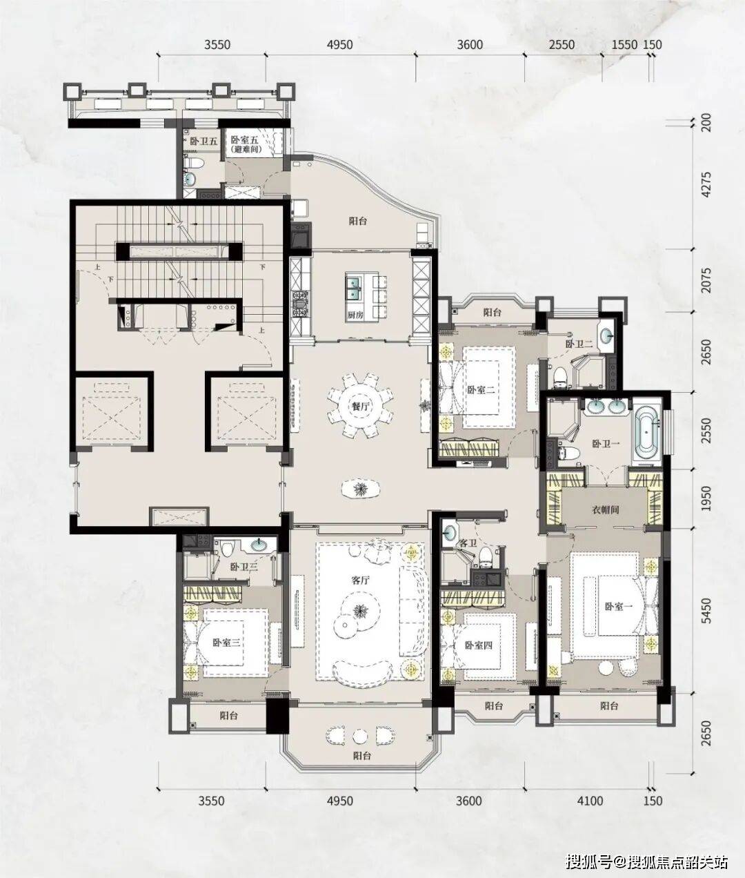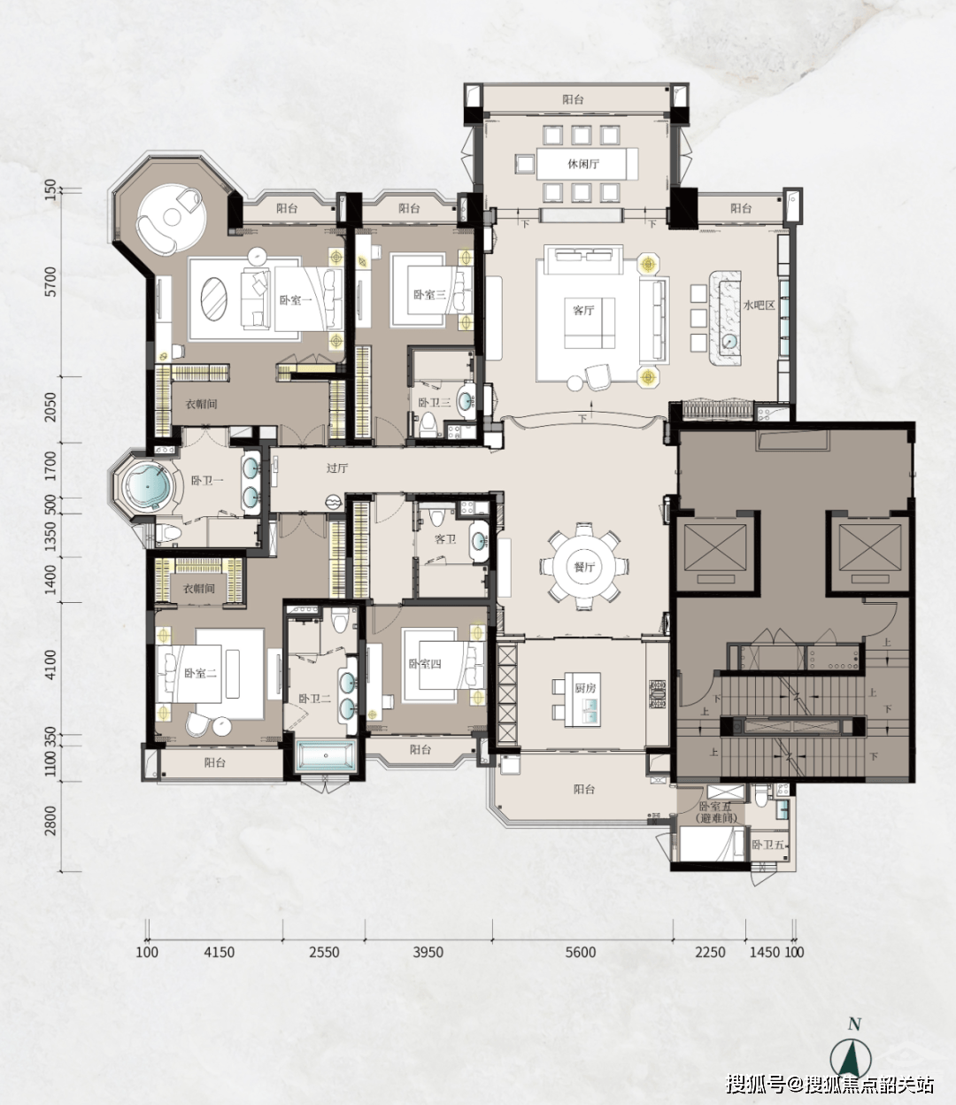 :这是一个五房三厅五卫的设计,空间布局合理,功能齐全。南北通透的设计,让室内空气流通顺畅。主卧套房设计,带有独立的卫生间和衣帽间,私密性极佳。客厅开间宽敞,连接超大阳台,可尽览江景。三个次卧也均配有飘窗,采光充足。整体设计既实用又大气,非常适合三代同堂的家庭居住。