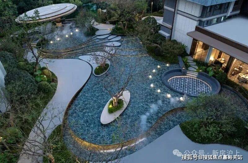 并且将中心场地抬高1米,在水系池底通铺1300多片的PRADA绿石(仿石砖)、精选斜飘乌桕、造型紫薇等名贵树种...