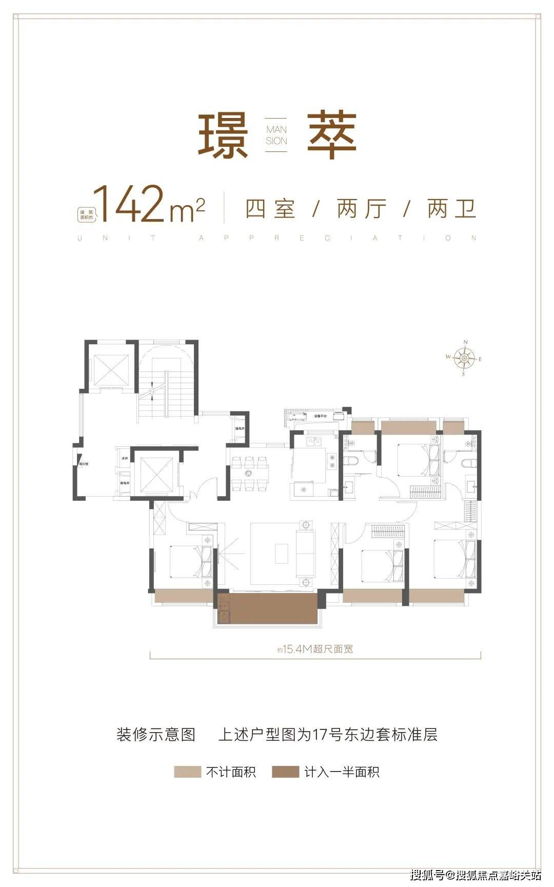 四开间朝南,南向面宽达约15.4米,其中三卧朝南。一般来说,4房户型中2房朝北是逃不掉的问题,但大华公园柏翠长面宽短进深的设计,让这个户型的得房率、采光度更上一层楼。