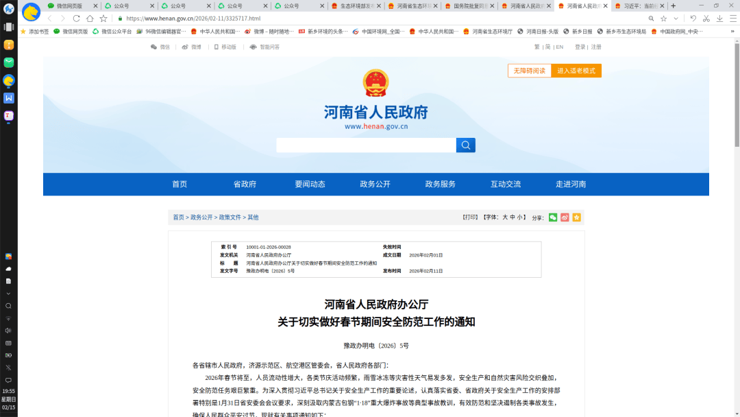 2026年2月11日,河南省人民政府办公厅发布《河南省人民政府办公厅关于切实做好春节期间安全防范工作的通知》。