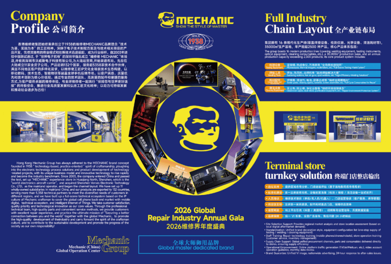 这一蓝图聚焦三大方向:一是生态链深化,整合工具、耗材、培训、售后等核心资源,打造覆盖消费电子、工业电子、汽车电子等多场景的“维修全链路一站式解决方案”;二是智能化升级,加大AI技术投入,开发更多智能辅助维修工具,持续降低行业技术门槛;三是全球化拓展与生态共建,在深耕现有海外市场的基础上,建立更本地化的供应链与服务体系,并积极构建开放的合作伙伴生态,与加盟商、用户及行业机构携手,共同推动维修工具行业标准的制定与规范化发展。目前,全球300多家加盟门店已成为这一生态的重要节点,通过品牌输出的标准化管理、技术指导和运营支持,不断提升着全球维修服务的整体水准。