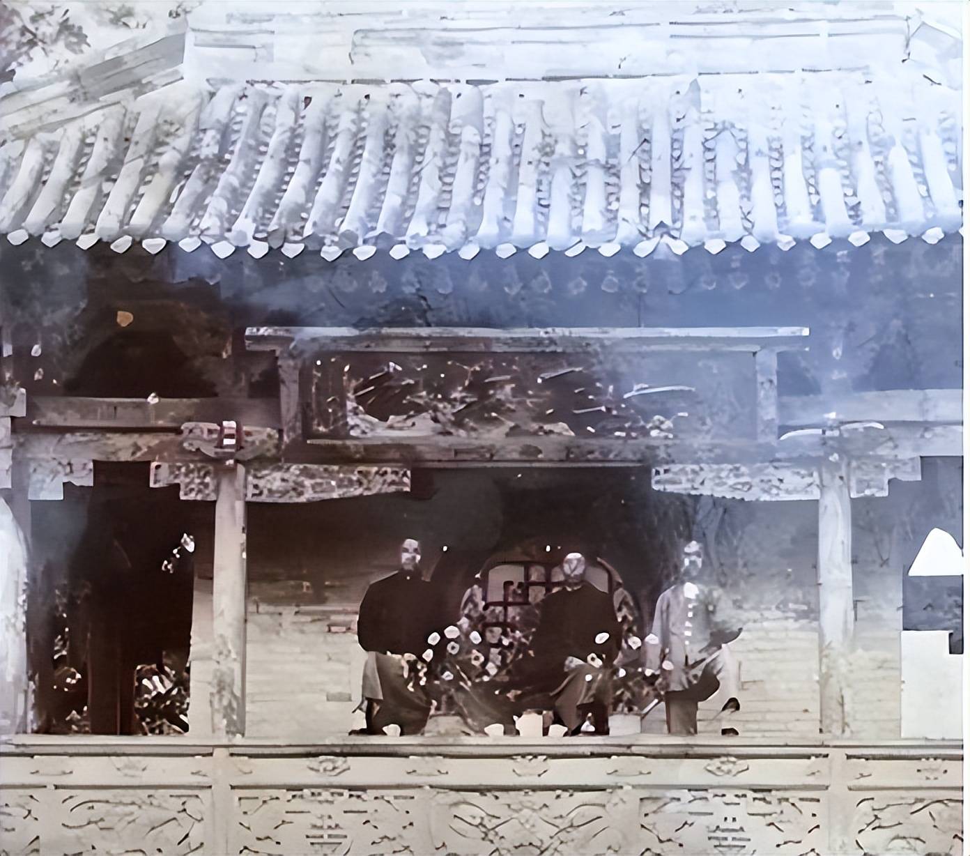图片说明;演武曾经的魁星楼第二层(剪辑后图),人物中间是民国年间乡绅社首王寿堪(守让祖父,志虎曾祖父),两边是韩家桥李大生和。(由王守让提供)