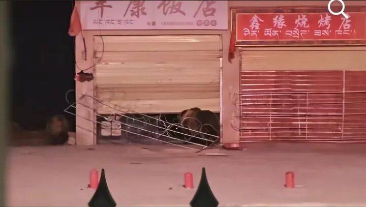 相关视频显示,在一临街饭店前,一头大黑熊使劲拍打店铺的卷帘门,最终它将铁丝网围挡从一旁扯坏,将卷帘门向上推开并进入,后又有一只黑熊跟随进入。