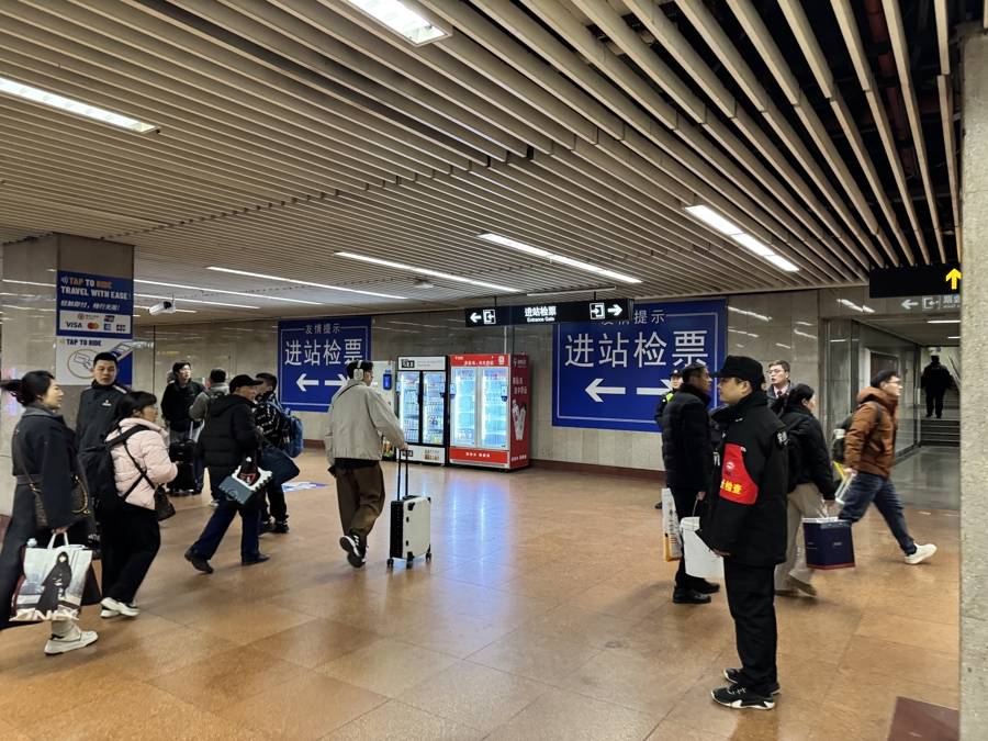 许多旅客顺着“进站检票”的标识指引,迅速被分流到左右两侧的安检口,通过安检迅速进站;一些旅客则在地铁工作人员的帮助下,在自动售票机上购买车票。
