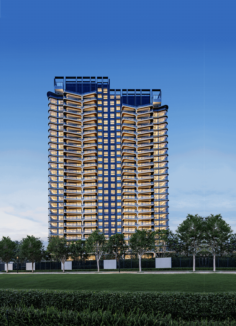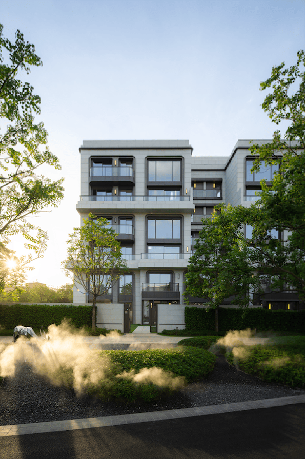 项目建筑采用全幕墙弧形立面,以干挂石材+铝板+玻璃的高端搭配,融合新古典主义风格与现代美学,既彰显豪宅质感,又与周边自然景观和谐共生。园林设计以岛居庄园为主题,打造三轴五境新古典主义园林,灵感源自欧洲庄园中央花园,搭配约800株珍稀小叶榕与2.3公里浓荫江堤,将岭南水乡生态与欧式园林美学完美融合,让业主在城市中轴之上,享受自然静谧的居住氛围。