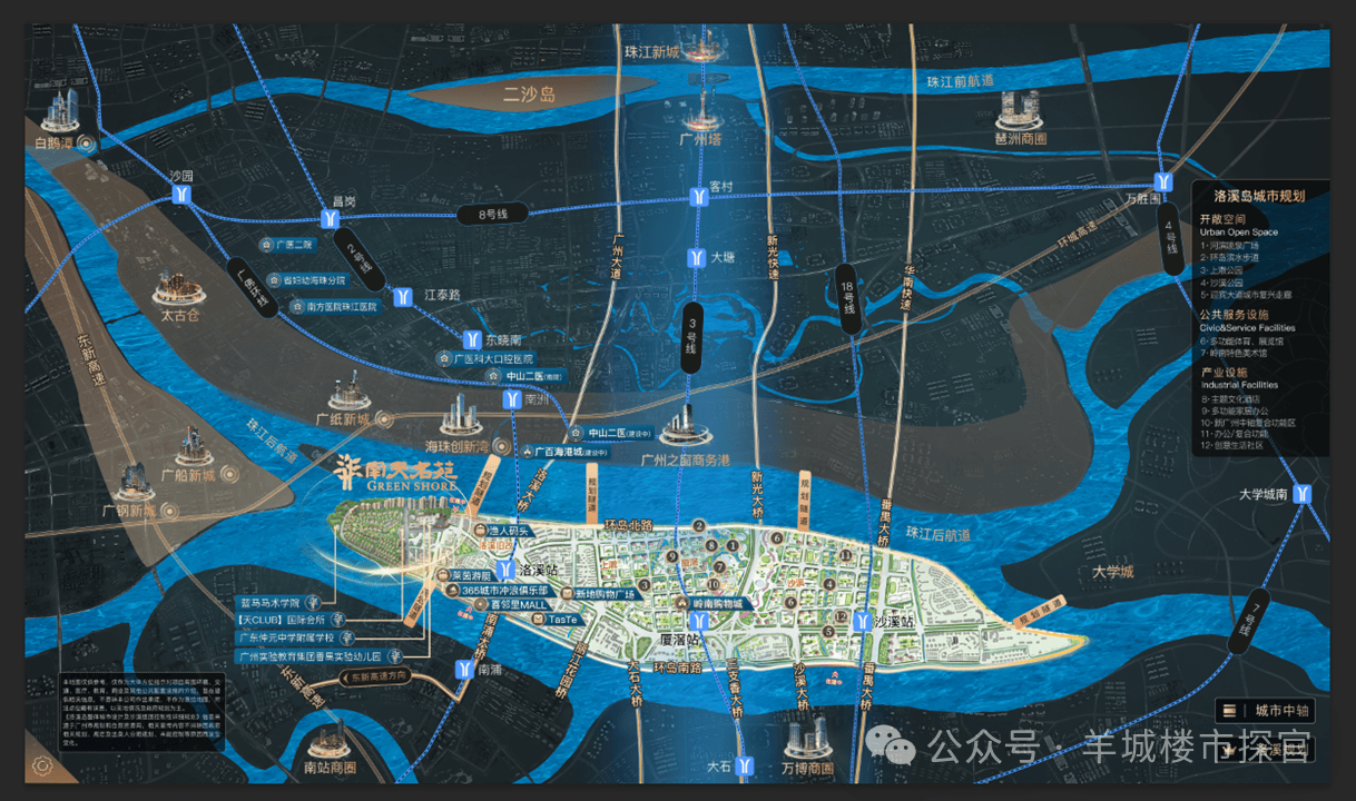 项目坐落于洛溪岛岛尖,作为继二沙岛之后广州第二个中轴岛,地处城市中轴与珠江后航道交汇处,跻身珠江后航道高端豪宅居住带,2018年被正式纳入广州主城区核心地段,享受城市中轴南移带来的多重规划利好。项目整体规划遵循“生态优先、品质为王”的理念,兼顾低密度居住体验与高端生活配套,形成“离尘不离城”的理想生活尺度,既坐拥三江汇聚的自然盛景,又可便捷链接城市核心资源。