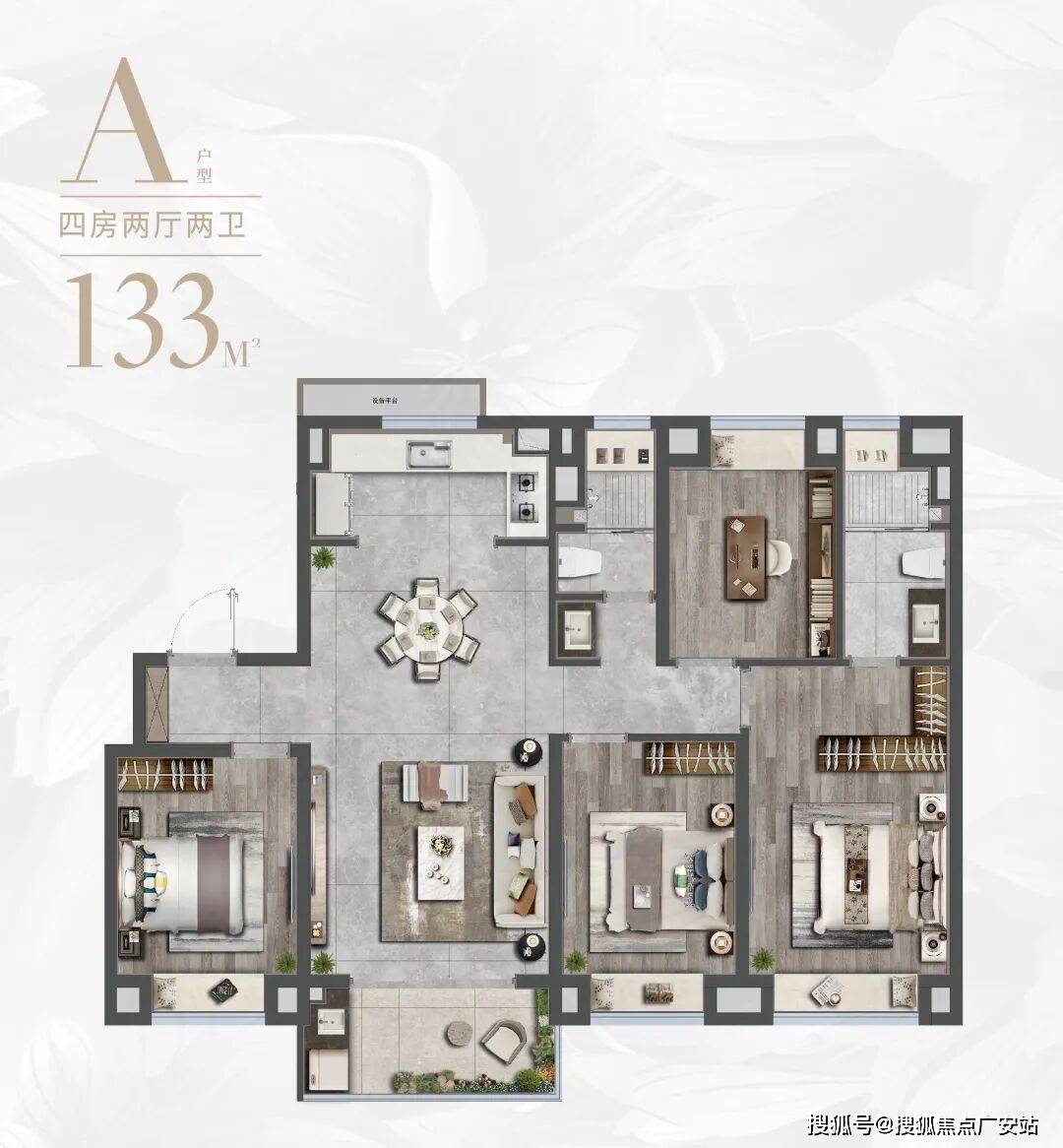 其次,项目约133㎡户型设计精妙,4房功能性足以匹配二胎或三代同堂家庭,格局上做到了惊人的四开间朝南+南北通透+主卧套房设计,采光通风性能和居住舒适度都保持在较高水准。
