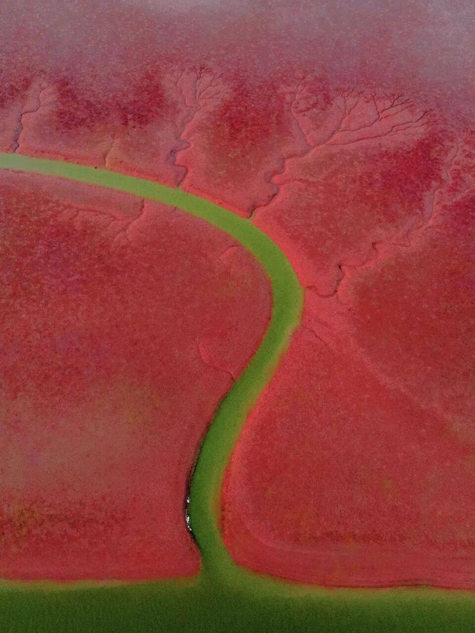 在东营的红滩湿地,一望无际的盐地碱蓬草在盐碱滩上燃烧成一片炽烈的“海洋红毯”,这种极致的生命力,是任何颜料都无法复制的壮美。