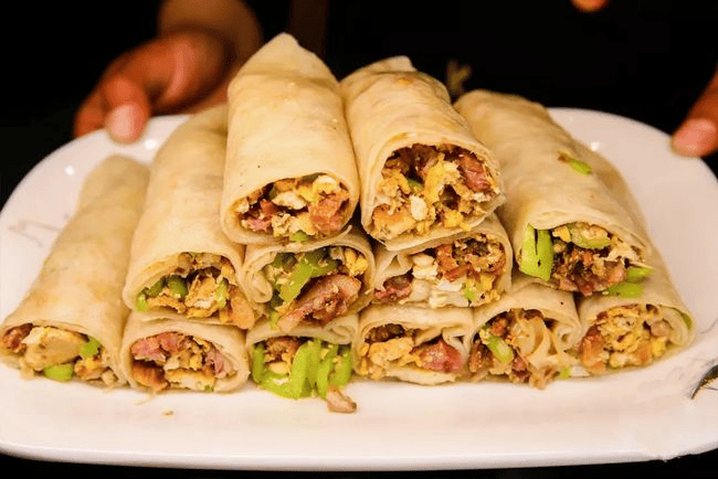 滨州的锅子饼是家的味道。薄饼卷上由蔬菜、鸡蛋、肉类等炒制的合菜,外形饱满,内容实在,是一口吃下多种满足的温馨小食。
