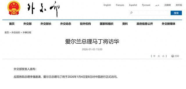 就在各方都盯着中韩这场高规格互动时,中国外交部公布:爱尔兰总理马丁应邀于1月4日至8日访华。