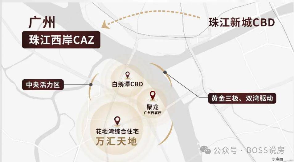 形成黄金三极格局,分别侧重于“产” “商” “居”,促进人城产深度融合,重新打造广州城市副中心。不同于传统CBD,这片珠江西岸CAZ中央活力区将融合商务、休闲、文化、高品质居住、旅游产业
